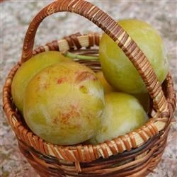 Blommetræet ‘Reine Claude d’Quillins” får store, runde, gulgrønne frugter, der modner i september.