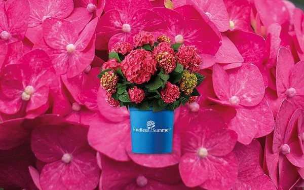 Havehortensia (Endless Summer `Summer Love`) blomstrer kontinuerligt over lang tid i hindbærrøde farver. Kompakt vækst, velegnet i krukker på terrasser eller på altaner. Overdådig blomstring.